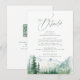 Watercolor lush green pine forest and misty mountain with sage modern script, elegant and romantic, great details cards with QR code for boho rustic wedding and mountain forest destination wedding in spring and summer.