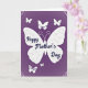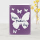 Cette carte présente un fond violet profond avec un aspect doux et texturé, semblable à un tissu, qui procure une sensation de convivialité et d'intimité ❤️. Au centre, un grand papillon blanc déploie de larges ailes ornées de motifs légers et ondulants, rappelant une délicate dentelle. Sur le corps du papillon, le texte « Joyeuse fête des Mères » apparaît en lettres blanches fluides, s'étendant soigneusement de l'aile gauche à l'aile droite. Plusieurs petits papillons blancs voltigent à proximité, disposés de manière à sembler encercler le principal, tels des compagnons proches. Un petit papillon porte le mot « SŒUR » en lettres blanches, et un autre papillon en bas indique « À ma SŒUR », suggérant un lien attentionné et fraternel dans la façon dont ils planent ensemble. Des détails floraux discrets dans les coins, de couleur blanc pâle, apparaissent en haut et