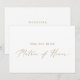 Cette carte de demande de témoin de mariage en or délicat est parfaite pour un mariage moderne. Le design romantique minimaliste présente une typographie élégante et charmante de couleur jaune doré champagne sur fond blanc avec un look épuré et simple. Personnalisez la carte avec le nom de la mariée et celui de la demoiselle d'honneur. Personnalisez le verso de la carte avec un message personnalisé.