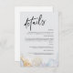 Tenez vos invités informés avec style grâce à notre carte de détails de mariage élégante et moderne. Caractérisée par une typographie noire chic associée à un texte sans empattement moderne, cette carte est parfaite pour partager les informations essentielles sur le mariage, telles que les détails de la réception, l'hébergement, la liste de mariage, et plus encore. Les accents floraux à l'aquarelle douce et dorés ajoutent une touche de sophistication et d'élégance. Entièrement personnalisable, cette carte garantit que vos invités disposent de tous les détails nécessaires tout en complétant votre thème de mariage. Idéale pour les mariages modernes, minimalistes ou romantiques, ce design ajoute une touche raffinée à votre suite de papeterie de mariage.