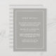 Elégante et simple, cette petite carte en gris-beige neutre vous permet de partager les détails clés avec vos clients mariages. Conçues pour correspondre à notre collection de mariages intemporels, les cartes sont dotées d'une bordure géométrique blanche et de lettres serif classiques. Vous vous demandez quelles informations inclure sur un encart faire-part de mariage ? Prenez en compte des détails comme l'hébergement à l'hôtel, les codes de groupe, le transport, l'itinéraire, les informations sur la réception de bienvenue et votre URL du site Web mariage. Vous pouvez même télécharger une carte vers l'envers à l'aide de la fonction Personnaliser.