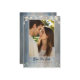 Annoncez la date de votre mariage avec une élégance rustique en utilisant cette carte de faire-part de date de mariage avec photo. Avec des florales de baby's breath bleu doux, des guirlandes lumineuses et un fond en bois de grange, ce design encadre parfaitement votre photo préférée. Parfait pour les mariages champêtres, les lieux de réception de ferme ou les cérémonies en plein air romantiques. Personnalisez avec vos noms, date de mariage et photo personnalisée pour créer une première impression sincère.