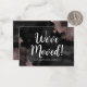Une carte de faire-part émouvante. Faites savoir à vos amis et à votre famille que "nous avons déménagé" et changez d'adresse. Une élégante aquarelle en or noir et rose ou faux rose ou encre d'alcool. Un look simple et moderne pour une ambiance élégante et design. Une élégante typographie de calligraphie de script pour le que nous avons déplacé, et une simple police moderne pour le contraster. Aussi disponible en d'autres teintes métalliques. Élégant Rose Noir Or Changement D'Adresse Carte