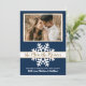 Cartes de Faire-part de grossesse de Noël modernes Blue, Gold et White Snowflake. Attendez-vous à des parents ! Script de typographie en or lettré moderne "plus la carte plus merrier" pour partager vos bonnes nouvelles avec votre famille et des amis pendant la saison des fêtes. Doté d'un énorme flocon de neige blanc sur arrière - plan de couleur marine moyenne et d'un modèle photo horizontal avec un petit accent doré. À l'arrière des points blancs sur un arrière - plan bleu profond. Facile à personnaliser. Si vous avez besoin d'aide ou d'articles correspondants, veuillez contacter le concepteur !