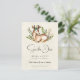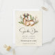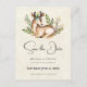 Faire-part de mariage avec un joli cerf couché entouré de flore feuillue. Design de style Bohème rustique.
