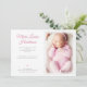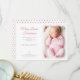 Bébé fille photo faire-part de naissance points rose avec votre photo préférée de nouveau-né sur le devant droit. Une superposition de photo en dégradé blanc adoucit les bords de la photo - cet effet peut être désactivé à l'intérieur de l'outil de conception. Le côté avant gauche a de la place pour votre texte personnalisable et les statistiques de naissance comme nom, date de naissance et heure et mesures. Vous pouvez également ajouter du texte ou du poème personnalisable. La petite couleur de coeur peut également être customisée avec une couleur qui correspond à votre photo ou votre sexe. Le dos a de petits points faisant un motif classique et sucré en rose et blanc. Customisez et commandez le vôtre aujourd'hui, une douce introduction de votre nouveau-né et un souvenir pour la famille et les amis.