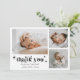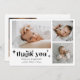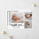 Carte faire-part de naissance simple et rétro avec un collage photo avec un texte de police rétro qui dit "merci" avec des étoiles autour.