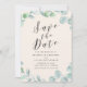 Faire-part moderne avec "Save the Date" affiché dans un script calligraphique gris foncé sur fond crème. Une couronne de feuilles d'eucalyptus aquarellées dans plusieurs nuances de vert entoure vos noms, date de mariage, lieu de mariage, etc. Le faire-part eucalyptus se retourne pour afficher un fond vert sauge avec espace pour les photos et le texte supplémentaire.