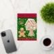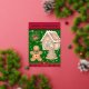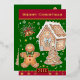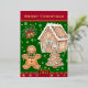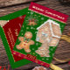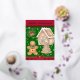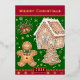 Carte de Noël traditionnelle avec homme en pain d'épices vintage, maison et arbre de Noël fait de pain d'épices et de flocons de neige tomber autour. Changez facilement le message du nouvel an et des vacances à votre carte familiale personnalisée.