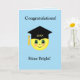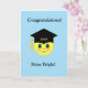 Carte de félicitations "Shine bright" avec chapeau de diplômé et visage heureux sur fond bleu clair. Idéal pour les remises de diplômes. Le texte peut être personnalisé !