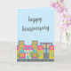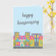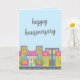 Cartes "joyeux anniversaire de maison" au script fantaisiste pour le marketing immobilier. Le design présente un quartier urbain mignon sur un fond bleu clair. Parfait pour les agents immobiliers résidentiels, les prêteurs hypothécaires, les agences de titres, les services d'inspection de maison, etc.