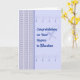 La carte de félicitations pour un diplôme en éducation est un design bleu clair (les couleurs d'un diplôme d'études) avec casquettes de diplôme, un diplôme, et un design latéral à gauche de la carte. Parfait pour un diplôme en éducation.