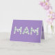 Carte de fête des mères pour Mam. Vous appelez votre mère Mam, et non Maman. (Mam signifie mère en pendjabi, néerlandais, gallois et hindoustani). Imaginez comme Mam sera ravie de recevoir une carte de fête des mères qui lui est spécialement adressée ! Votre mam adorera également le magnifique motif floral de cette carte qui indique "Mam" écrit avec de petites fleurs blanches sur fond violet, et "Joyeuse fête des mères !" écrit avec de petites fleurs blanches à l'intérieur.