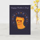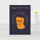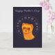 Carte de fête des mères pour une maman furet mignonne avec une illustration numérique en jaune, orange et violet représentant l'un de ces animaux duveteux adorables en train de sourire, des éléments décoratifs, des fleurs et des étoiles autour. Cadeau idéal pour une maman furet.