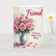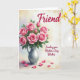 Conçu avec un généreux bouquet de roses roses rassemblées dans un pichet à tons argentés, l'œuvre d'art place les fleurs haut au centre pour que votre œil s'attarde sur chaque pétale recourbé. Les fleurs vont de boutons serrés à des fleurs complètement épanouies dans des nuances de rose et de fuchsia, et les spirales douces des pétales ressemblent à un échange silencieux d'affection ❤️. Des feuilles vert foncé complètent l'arrangement, ajoutant du contraste et une apparence confortable et soignée. Sous le pichet, un dessus de table pâle porte des pétales roses éparpillés, comme une trace légère laissée derrière après un doux moment partagé. Le fond mélange des tons jaune clair, pêche et lilas pâle, donnant à toute la scène une lueur chaude et aérée. Un texte indiquant « Amie » est placé près du haut dans un style sombre et fluide, tandis que « Vous souhaite un joyeux jour de la fête des Mères » apparaît en bas à droite dans une écrit