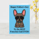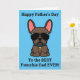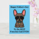 Frenchies, montrez à votre père un peu d’amour pour la fête de ce Père avec une carte personnalisée juste de vous. Le message au recto de la carte dit : "Bonne fête des pères au meilleur papa français !" Le message intérieur dit : "Je t’aime plus que les promenades, Joyeuse Fête des Pères". Le dessin présente un joli dessin animé illustrant un bulldog français de couleur marron masculin portant un collier bleu et des lunettes de soleil d'aviateur noir. Police et couleur arrière - plan et être modifié en sélectionnant "Cliquez pour customiser plus loin".