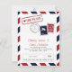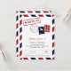 Carte de sauvegarde de date sur le thème de voyage par avion en rouge et bleu. Timbre faux et marques de poste pour un mariage.