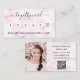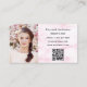 Marbre rose pâle comme arrière - plan, texte noir Sur le devant : Ajoutez vous escompte. Retour : Personnalisez et ajoutez votre photo, nom, titre, numéro de téléphone, courrier, adresse du site, code qr à votre site Web. Lettres violettes. Sans parties scintillant à l'arrière.