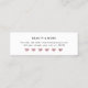 Carte de fidélité cardiaque simple et élégante. Récompensez vos clients fidèles avec cette carte de fidélité au coeur simple et élégante, idéale pour les petites entreprises, salons, spas, cafés et boutiques. Conçue dans un mini format élégant (3,0 po x 1,0 po), cette carte de fidélité comporte 5 points punch, avec une récompense accordée lors de la 6e visite (par exemple remise, produit gratuit ou service spécial). Une icône au coeur minimaliste et une police élégante donnent à cette carte un look moderne et élégant. Disponible en 4 options de couleur chic pour correspondre à votre marque Compact mini taille - facile à transporter et à stocker Personnalisable : ajoutez votre nom d'entreprise, vos coordonnées ou une offre spéciale Idéal pour la rétention des clients et la reconnaissance de marque