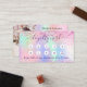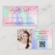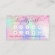 Un arrière - plan holographique branché aux couleurs unicorne et aux couleurs arc-en-ciel rose, violet, or rose, vert menthe. Décoré avec de la poussière de parties scintillant à l'avant : Ajoutez vous réduction. Retour : Personnalisez et ajoutez votre photo, nom, titre, numéro de téléphone, courrier, adresse du site, code qr à votre site Web. Lettres violettes. Sans parties scintillant à l'arrière.