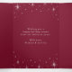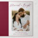 Fêtez votre premier Noël en couple avec notre carte photo de vacances Marié et Bright ! L'avant de la carte présente "Marié & Lumineux" dans un script moderne écrit à la main de canneberge. Votre photo de mariage est affichée avec une bordure blanche rugueuse. Personnalisez l'avant de la carte en ajoutant un message d'accueil personnalisé avec vos noms indiqués ci-dessous. L'intérieur de la carte comporte deux photos avec espace pour un message personnalisé au milieu. Le rabat intérieur extérieur comporte une quatrième photo verticale. Le milieu extérieur de la carte affiche un arrière - plan de canneberges avec un motif étoilé blanc brillant.