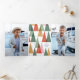 Cette carte de vacances moderne présente une scène forestière ludique composée de formes géométriques colorées d'arbres dans les tons vert, orange, rose et rouge. Les arbres abstraits sont complétés par de délicats flocons de neige disséminés dans le design, ce qui lui donne une ambiance hivernale festive. Le message "Joyeuses fêtes" est subtilement placé en lettres bleues, ajoutant une touche d'élégance à l'illustration vibrante et créative. Idéal pour envoyer des voeux de vacances chaleureux avec une touche contemporaine.