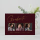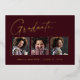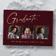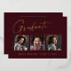 Cartes de papier doré "3 Photo" de graduation, propres, tendance, modernes et élégantes (votre choix d'or argenté ou de papier rose), avec éléments design de texte moderne avec un script d'encre calligraphie unique. Les photos du diplômé sont accentuées d'une finition partielle délicate et minimaliste. Le dos de la carte offre des espaces de texte personnalisés pour des informations sur votre diplôme ou peut être effacé si vous souhaitez écrire un message à la main. Rouges bordeaux avec feuille d'or ou customisez facilement l'arrière - plan pour correspondre à la couleur primaire de votre école ou à toute couleur de votre choix. Parfait pour les étudiants de deuxième cycle du secondaire, du collège et de l'université.