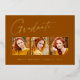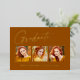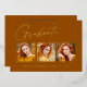 Cartes de papier doré "3 Photo" de graduation, propres, tendance, modernes et élégantes (votre choix d'or argenté ou de papier rose), avec éléments design de texte moderne avec un script d'encre calligraphie unique. Les photos du diplômé sont accentuées d'une finition partielle délicate et minimaliste. Le dos de la carte offre des espaces de texte personnalisés pour des informations sur votre diplôme ou peut être effacé si vous souhaitez écrire un message à la main. Oranger brûlé, couleur rouille avec feuille d'or ou customiser facilement l'arrière - plan pour correspondre à la couleur primaire de votre école ou toute couleur de votre choix. Parfait pour les étudiants de deuxième cycle du secondaire, du collège et de l'université.