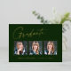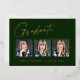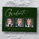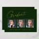 Cartes de papier doré "3 Photo" de graduation, propres, tendance, modernes et élégantes (votre choix d'or argenté ou de papier rose), avec éléments design de texte moderne avec un script d'encre calligraphie unique. Les photos du diplômé sont accentuées d'une finition partielle délicate et minimaliste. Le dos de la carte offre des espaces de texte personnalisés pour des informations sur votre diplôme ou peut être effacé si vous souhaitez écrire un message à la main. Émeraude verte avec feuille d'or ou customisez facilement l'arrière - plan pour correspondre à la couleur primaire de votre école ou à n'importe quelle couleur de votre choix. Parfait pour les étudiants de deuxième cycle du secondaire, du collège et de l'université.
