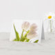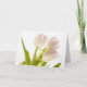 Cette carte de fleurs de tulipes blanches toutes occasions présente une photographie de trois tulipes blanches qui semblent osciller dans la brise. Une lumière magnifique derrière les fleurs brille à travers les pétales blanches des tulipes.