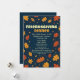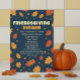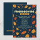 Invitez vos amis à un festin de vacances amusant avec cette invitation de dîner Friendsgiving élégante et moderne. Le design présente des feuilles orange et jaune qui tombent sur un fond bleu foncé contrasté. Cette carte est entièrement personnalisable avec votre adresse, les détails de RSVP et une note spéciale sur le fait de apporter un plat à partager pour un dîner potluck.