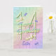 Un arc-en-ciel de couleurs, de fleurs roses et de papillons lavande remplit cette 14e Joyeuse carte d'anniversaire avec joie pour soeur. Le nom avant et le verset intérieur peuvent être personnalisés à l'aide du modèle fourni. Design original par Anura Design Studio.