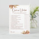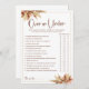 Élevez votre baby shower ou votre fête prénuptiale inspirée du style bohème avec notre carte de jeu "Herbe de Pampas Au-Dessus ou En Dessous", ajoutant une touche de charme rustique et d'excitation aux festivités. Les invités se délecteront en devinant si des scénarios spécifiques liés au mariage se situent au-dessus ou en dessous des paramètres spécifiés, le tout sur fond de teintes dorées et d'accents d'herbe de pampas fantaisistes. Parfait pour les thèmes de baby shower ou de fête prénuptiale bohème, ce jeu promet des rires et du plaisir, créant des souvenirs inoubliables pour la future mariée et ses invités.