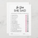 Ajoutez une touche moderne à votre baby shower de mariage avec des cartes de jeu Il a dit, Elle a dit en noir et blanc personnalisables, parfaites pour la dernière fête avant l'anneau ! Les invités s'amuseront à deviner qui a dit quoi, ce qui en fait un ajout amusant et mémorable aux festivités.