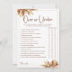 Élevez votre baby shower ou votre fête prénuptiale inspirée du style bohème avec notre carte de jeu "Herbe de Pampas Au-Dessus ou Au-Dessous", ajoutant une touche de charme rustique et d'excitation aux festivités. Les invités s'amuseront à deviner si des scénarios spécifiques liés au mariage se situent au-dessus ou en dessous des paramètres spécifiés, le tout sur fond de tons dorés et d'accents d'herbe de pampas fantaisistes. Parfait pour les thèmes de baby shower ou de fête prénuptiale bohème, ce jeu promet rires et plaisir, créant des souvenirs inoubliables pour la future mariée et ses invités.