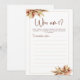 Rehaussez vos rassemblements sur le thème rustique avec notre jeu imprimable enchanteur "Qui suis-je" qui présente l'attrait intemporel de l'herbe de Pampas sèche. Embrassez la chaleur de l'automne et l'esthétique boho-chic tandis que les joueurs devinent leurs personnages assignés sur un fond de teintes dorées et d'accents d'herbe de pampas fantaisistes. Parfait pour les douches de mariée avec une touche bohème, cette carte mélange sans effort sophistication et plaisir, ce qui en fait un ajout idéal aux thèmes de douches de mariée boho.