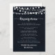 Cette ficelle illumine menu de baiser mariage carte de jeu est parfait pour une réception de mariage rustique. Le design présente de belles lumières à cordes peintes à la main dans un arrière - plan bleu foncé.