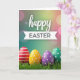 Cette carte montre quatre formes d'œufs décorés reposant dans une épaisse touffe d'herbe verte, disposés côte à côte le long du tiers inférieur comme des amis se penchant pour une photo 🐰. Chaque œuf a son propre style : l'un est rouge avec des rayures blanches nettes, un autre est jaune avec des points blancs, un troisième est violet avec des points blancs, et le dernier est vert avec des points blancs assortis. Au-dessus d'eux, le mot « happy » apparaît en lettres blanches fluides, centré et flottant dans l'espace ouvert. Directement en dessous, une fine bannière blanche contient « EASTER » en lettres majuscules sombres et simples, donnant au message une mise en page soignée et équilibrée. L'arrière-plan s'estompe en un flou doux de roses chauds, de jaune pâle et de sarcelle douce, avec des taches de lumière rondes qui ressemblent à des lanternes lointaines par une soirée printanière 🌷. L'éclairage est diffus et doux, ce qui rend les couleurs riches tout en gard