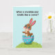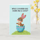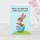 Cette carte de vœux représente un lapin mignon et anthropomorphe avec une fourrure brune chaude, des oreilles internes roses et de grands yeux bleus qui semblent regarder vers le haut avec un air amical et engageant 🐰. Une légère rougeur rose se pose sur ses joues, et quelques taches brun foncé ajoutent des détails sur son corps tandis qu'il jette un coup d'œil depuis une coquille d'œuf fissurée. La coquille d'œuf est turquoise avec des bandes roses ondulées et des points roses éparpillés, lui donnant un air festif et doux qui semble destiné à être partagé entre amis proches. Le lapin repose sur une colline verte doucement ondulée avec quelques traits d'herbe simples, sur un fond bleu ciel large qui garde la scène aérée et calme 🌷. Près du haut, une ligne de texte noir sans serif demande : « Qu'est-ce qui est invisible et sent la carotte ? », centré et facile à lire. La posture droite du lapin et sa tête légèrement inclinée ajoutent une énergie tendre et cur