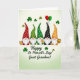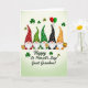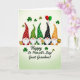 Cette carte montre cinq lutins du jour de la Saint-Patrick alignés épaule contre épaule au centre, leurs corps ronds et leurs longues barbes blanches leur donnant un air confortable et convivial 💚. Sur la gauche, un lutin portant un chapeau à pois rouge lève une chope dorée, comme s'il portait un toast aux autres, tandis que deux lutins coiffés de chapeaux verts à côté de lui portent des motifs tourbillonnants qui font écho aux trèfles qui les entourent ☘️. Près du côté droit, un lutin en chapeau noir tient des ballons rouges et verts qui flottent vers le haut comme une petite parade, et le dernier lutin porte un chapeau rayé orange tout en présentant un pot d'or brillant. Leurs chapeaux et accessoires ressortent sur un fond dégradé vert clair, avec un ombrage doux qui donne aux personnages une apparence doucement arrondie et rapprochée, comme des amis se penchant pour une photo. De petits trèfles de différentes nuances de vert sont dispersés autour de la ligne, remplissant l'espace sans encombrer les personnages. Le message « Joyeuse Saint-Patrick ! Grande Mamie ! » est écrit en lettres vert foncé, placé au-dessus et légèrement au-dessus du groupe pour qu'il soit lisible en un coup d'œil.