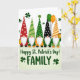 Sur le devant de la carte, cinq gnomes mignons se tiennent épaule contre épaule en ligne droite, leurs barbes blanches et duveteuses et leurs nez ronds leur donnant un air confortable et amical 💚. Chacun porte un haut chapeau conique avec un motif différent, notamment des pois rouges, des rayures vertes, des chevrons orange et blanc et un chapeau noir parsemé de blanc. Leur proximité et leurs poses légèrement inclinées les font ressembler à une petite photo de groupe, comme s'ils se penchaient pour partager un rire. De petits trèfles flottent autour d'eux, et deux ballons - un vert foncé et un orange vif - flottent à proximité pour une touche de fête ☘️. Un gnome tient un petit pot d'or tandis qu'un autre porte un petit seau doré, ajoutant un doux moment "nous avons apporté les friandises" entre amis. Sous les gnomes, le message « Joyeuse Saint-Patrick ! FAMILLE » est centré en lettres vertes, facile à rep