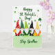 Cette carte de vœux représente cinq gnomes alignés côte à côte sur un fond blanc, leurs hauts chapeaux pointus parsemés de pois et leurs longues barbes blanches coulant sur des tenues vives. De gauche à droite, un gnome rouge lève une chope dorée comme s'il portait un toast à un ami, suivi de deux gnomes verts qui se penchent subtilement vers le groupe comme s'ils partageaient la même plaisanterie 💚. À côté se tient un gnome vêtu de noir tenant un trèfle près de la poitrine, ajoutant une touche tendre et affectueuse ☘️. À l'extrême droite, un gnome orange berce un pot d'or classique, complétant la rangée avec une atmosphère de célébration partagée et conviviale. Centré au-dessus des gnomes, le texte « Joyeux jour de la Saint-Patrick ! » apparaît en lettres vertes, s'incurvant en haut. Sous leurs pieds, un lavis de style aquarelle vert clair s'étend horizontalement, et les mots « Demi-fr