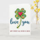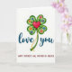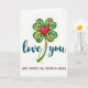 Cette carte présente un fond blanc avec un trèfle à quatre feuilles stylisé dans des tons de vert superposés, donnant aux feuilles un aspect arrondi et légèrement ombré. Au centre se trouve un cœur rouge brillant ❤️ qui attire l'œil comme une promesse tendre tenue près. Un mince ruban jaune se recourbe vers l'extérieur depuis le cœur, suggérant une connexion douce qui continue au-delà de la distance. De petites fleurs en rose, bleu et orange ornent chaque feuille, ajoutant une touche attentionnée et affectueuse comme des fleurs placées avec une dévotion silencieuse 🌼. Sous le trèfle, les mots « love you » apparaissent en sarcelle foncé, écrits en lettrage fluide et centrés sous l'œuvre d'art. Plus bas sur la page, une deuxième ligne de texte indique « HAPPY MOTHER'S DAY, MOTHER IN HEAVEN » en lettres rouges claires, espacées de manière égale et faciles à