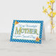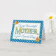 Une jolie carte de voeux pour la fête des mères, avec les lettres remplies d'un motif de jonquilles dorées, d'une aquarelle peinte à la main par Judy Adamson, avec des pois blancs sur bleu profond. Une partie de la collection Posh & Painterly 'Daffy-down-Dillies'.