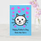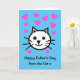 Dessin animé mignon d'un chat souriant pour la fête des pères. Le message indique 'Joyeuse fête des pères de la part du chat x'. La carte a un fond bleu avec des cœurs, mais il est facile de la modifier pour une couleur différente ou un blanc minimal agréable. Personnalisez facilement cette carte en modifiant le texte du modèle sur le devant et à l'intérieur. Merci de consulter mes créations - parfaites pour tous les papas de chats !