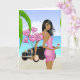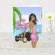 Carte de la Saint-Valentin afro-américaine avec une femme debout près d'une voiture classique sur la plage.