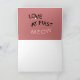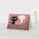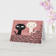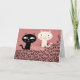 CHATS NOIRS ET BLANCS SE REGARDANT, LA CARTE A UN FOND ROSE ET PORTE L'INScription AMOUR PARTOUT, ET AUSSI MIAOU PLUSIEURS FOIS. À L'INTÉRIEUR IL EST ÉCRIT "COUP DE FOUDRE AU PREMIER MIAOU"