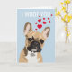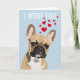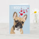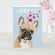 Carte de la Saint-Valentin drôle de chien avec un fond bleu pastel qui peut être changé en n'importe quelle couleur, un adorable bulldog français fauve, des cœurs d'amour rouges et les mots humoristiques "Je vous WOOF".