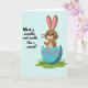 Cette carte montre un personnage ressemblant à un lapin aux longues oreilles qui regarde en sortant d'une fissure dans un œuf, faisant un petit salut de la patte qui ressemble à un amical bonjour 🐰. La créature est ombrée de brun chaud avec des oreilles intérieures roses, des yeux ronds noirs brillants et des fines moustaches qui adoucissent son visage. La coquille de l'œuf est turquoise avec des lignes ondulées roses et des points éparpillés, posée sur une petite touffe d'herbe verte qui suggère un moment printanier en plein air 🌷. Derrière tout cela, un fond bleu ciel pâle et lisse maintient l'attention sur le personnage et sa pose douce et accueillante. Sur le côté gauche, une énigme est imprimée en lettres arrondies et courbes : « Qu'est-ce qui est invisible et sent la carotte ? ». Le texte est en encre foncée pour un contraste fort avec le fond clair, espacé pour équilibrer le lapin sur la droite. Les formes simples et les zones de couleur unie donnent à la scène un aspect net et moderne, tandis que l'expression douce du lapin ajoute une touche