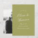 Cette carte de save the date de mariage vert olive allie une calligraphie intemporelle à l'élégance éditoriale moderne. Conçue avec une influence européenne raffinée et la chaleur subtile de l'Île Citrus, elle capture la romance de la campagne italienne tout en se sentant fraîche et contemporaine. Le verso présente votre photo de fiançailles préférée pour une révélation personnelle et à fort impact. Parfaite pour la mariée sophistiquée qui aime le luxe discret avec une touche significative. Associez-la à des enveloppes olive ou à des bords crantés pour une suite cohérente.